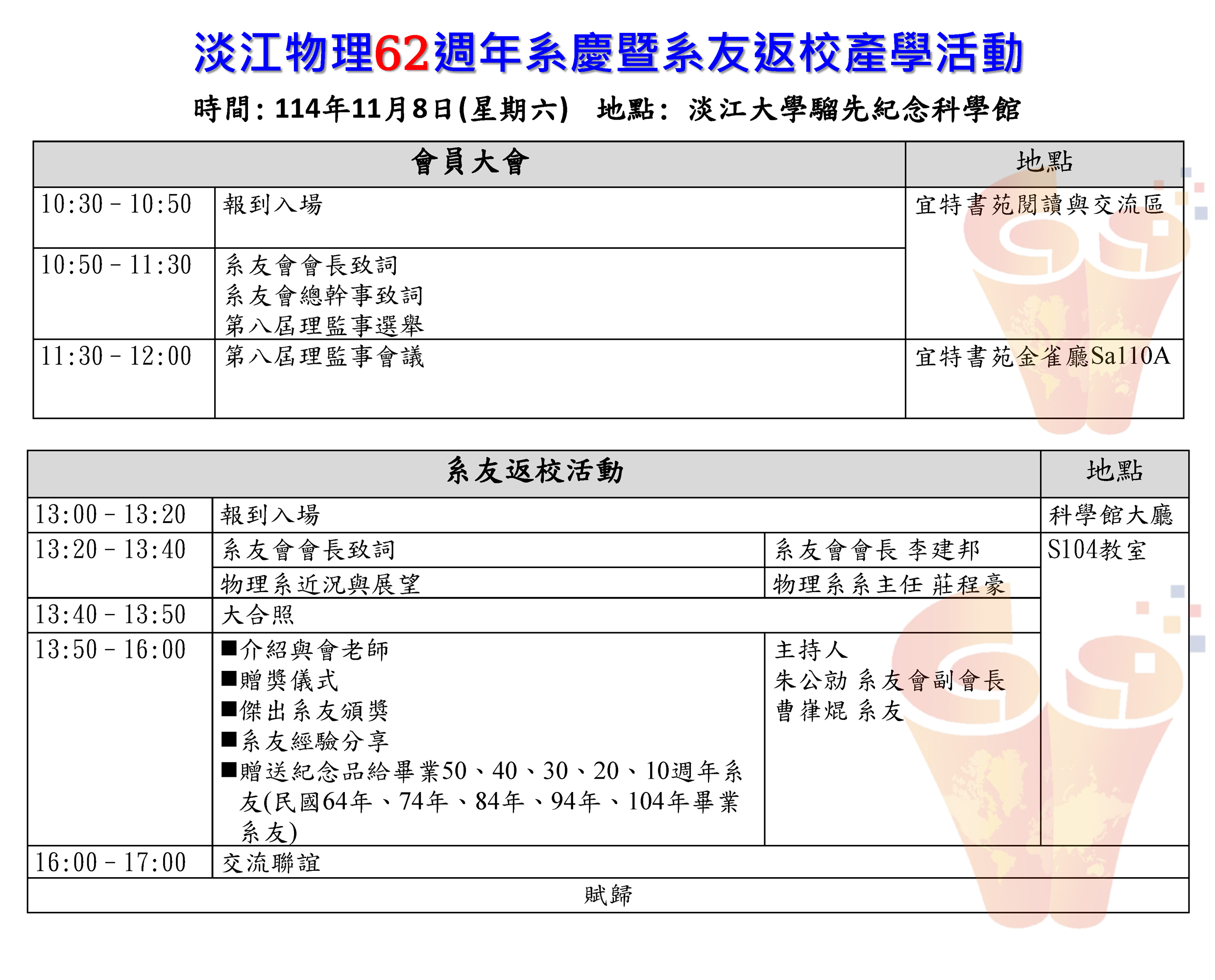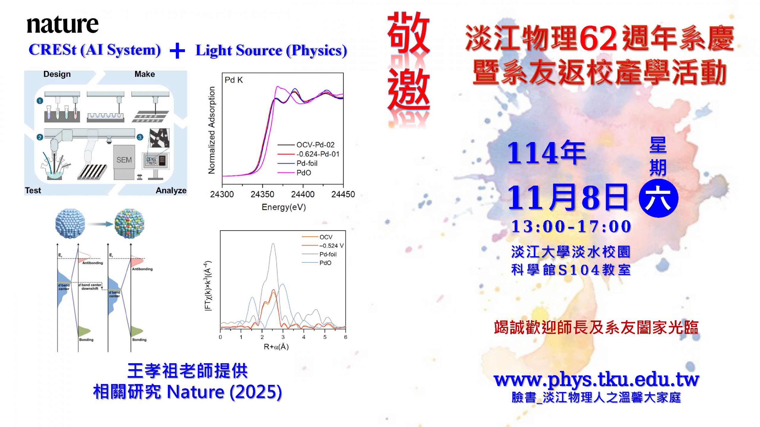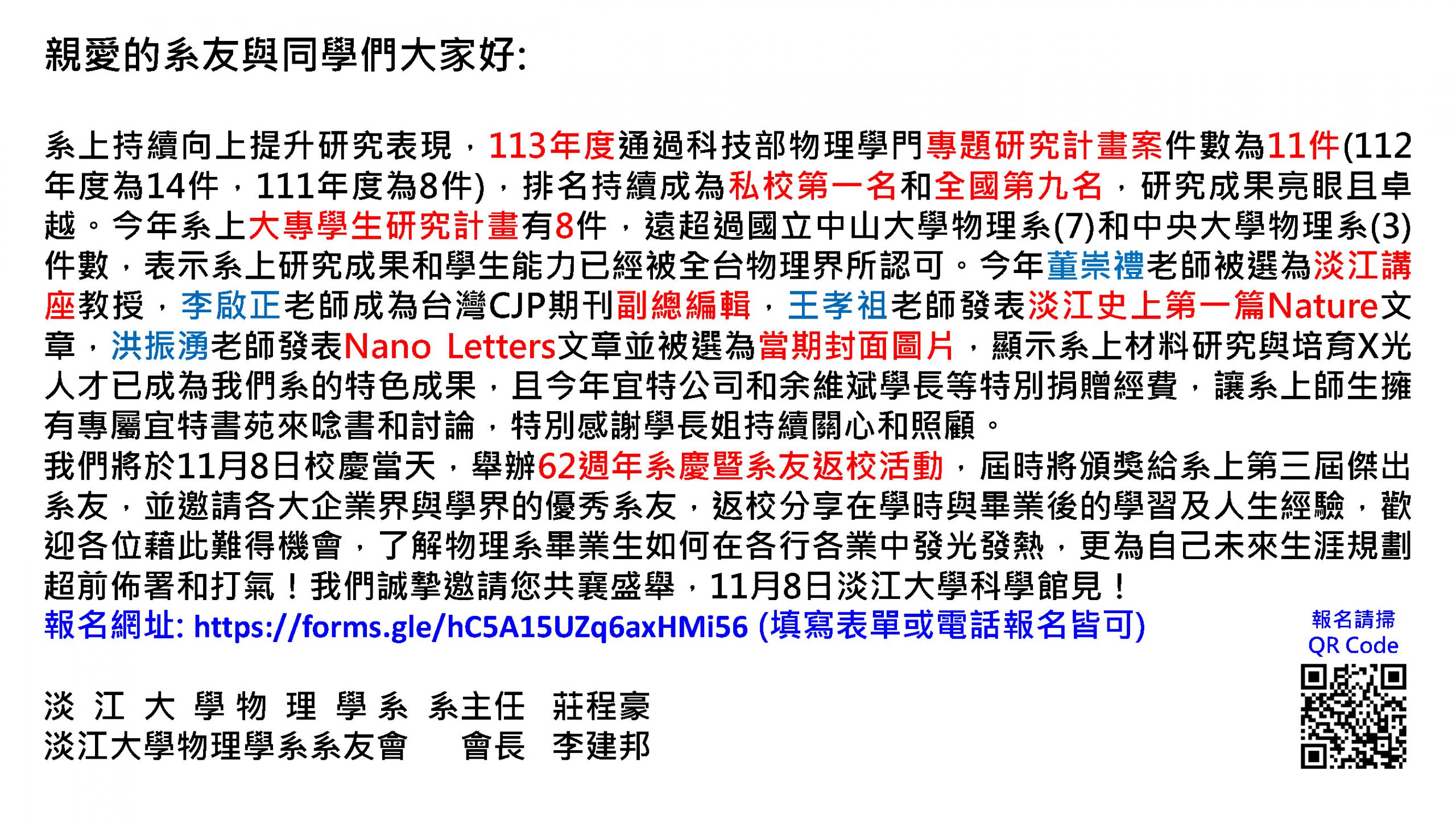 歲月如歌,情誼如初,在這特別的時刻,我們誠摯邀請您參加即將舉辦的「淡江物理系62週年系友返校日」活動。